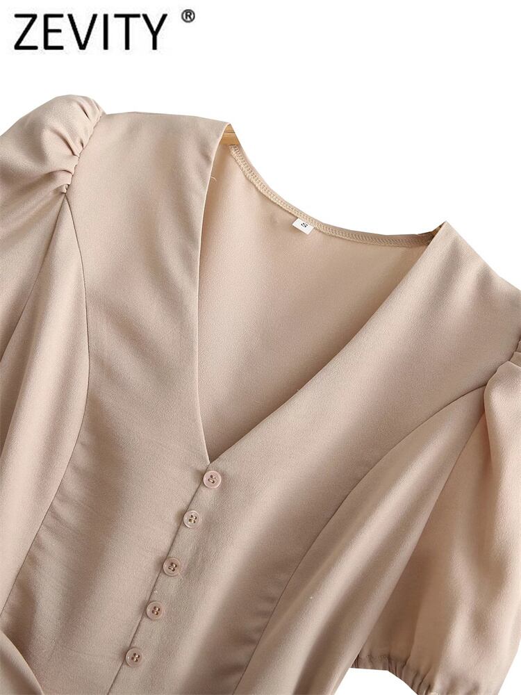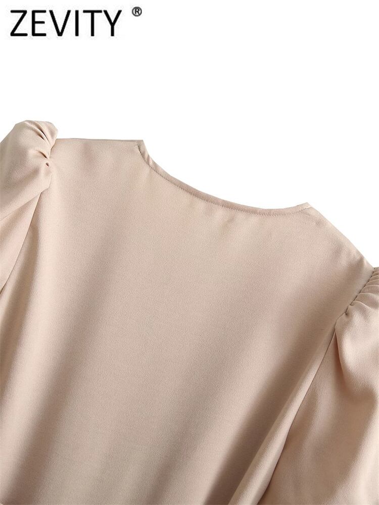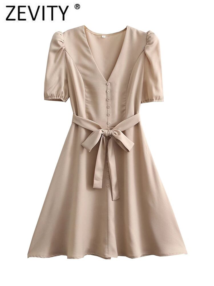 女性Vネックボタンデコレーションミニシャツドレスシックなパフスリーブボウサッシュスリム リボン