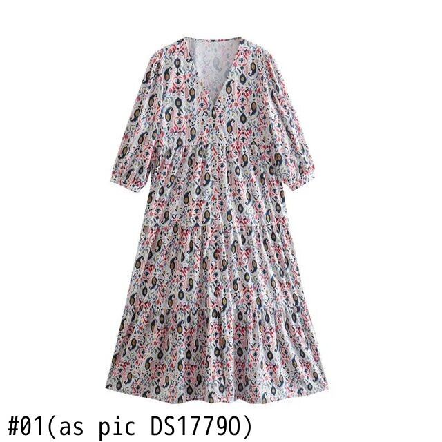 女性VネックコートペイズリーグラフィティプリントプリーツミディドレスシックなハーフスリーブルーズベスティドスDS1779 半袖