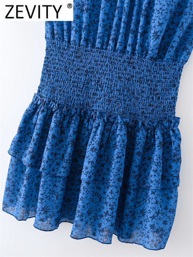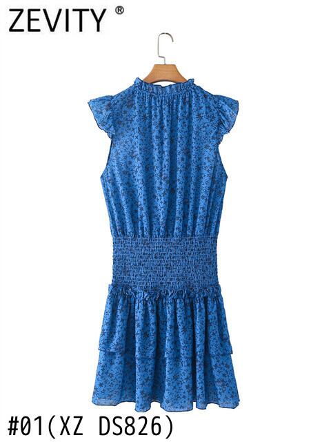 ZEVITYWomenShrinkプリーツスタンドカラープリントフリルケーキドレスシックサマーウエストスリムシフォン ラッフル 夏物