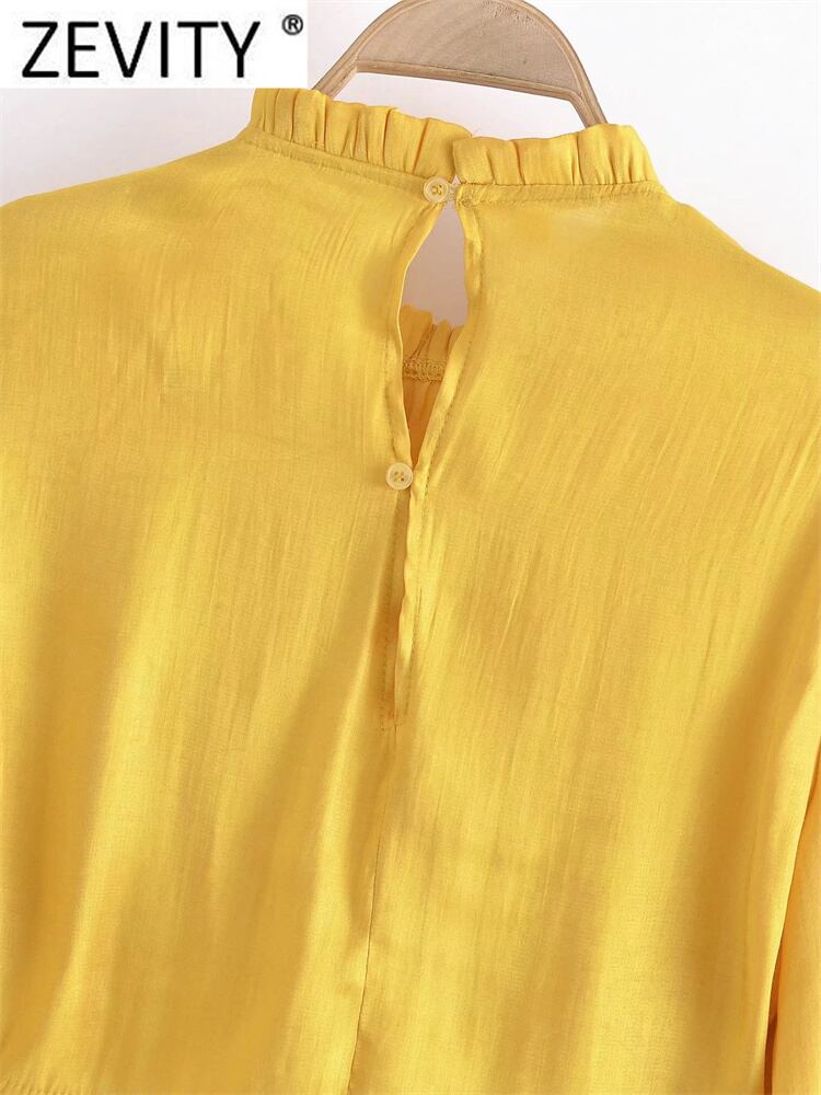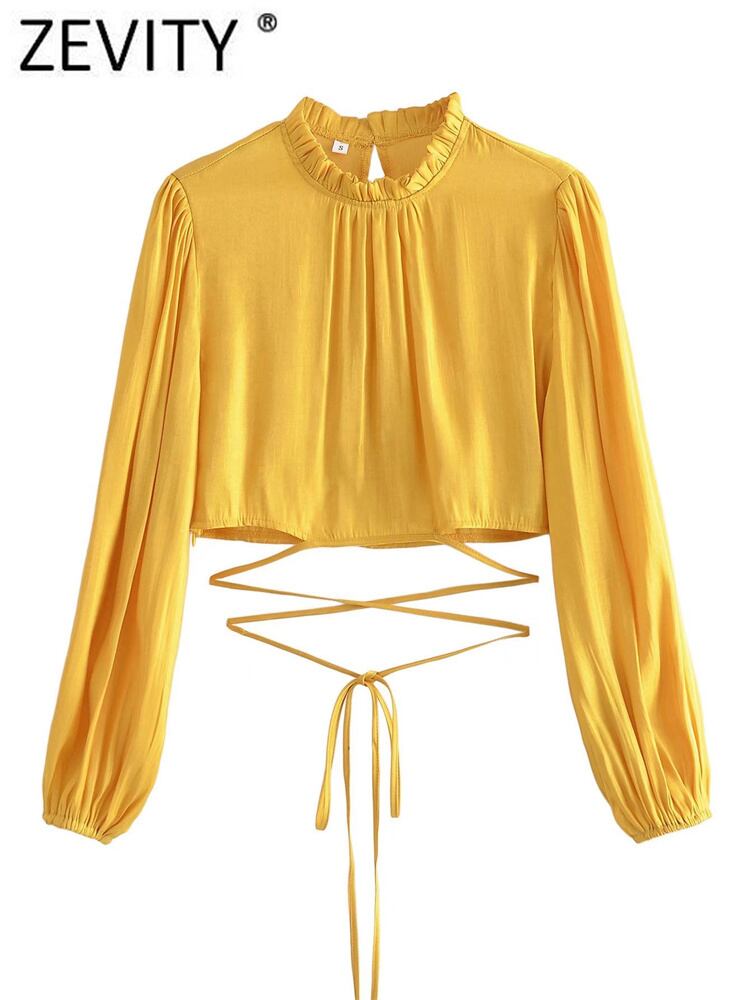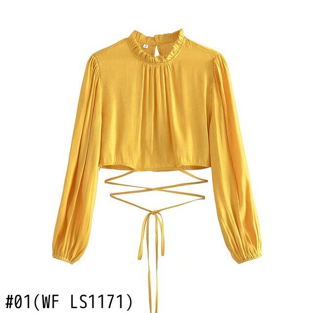 女性プリーツフリルスタンドカラーイエローショートスモックブラウス裾レースアップシャツシックなジッパークロップトップLS1171 ラッフル