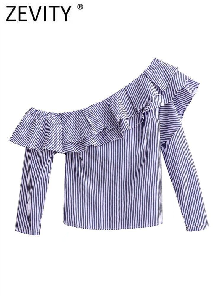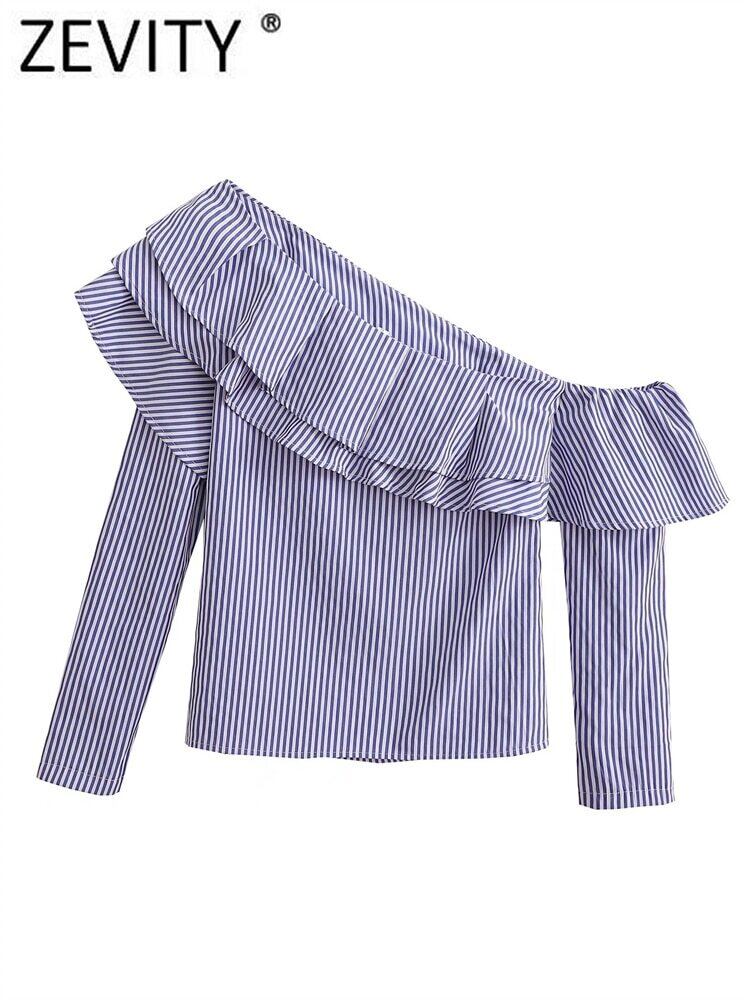 女性ストライププリントプリーツフリルアシンメトリースモックブラウス長袖スリムシャツシックトップスLS964 ロング ラッフル