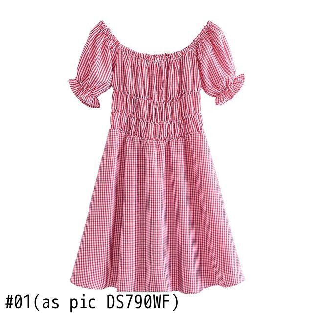 女性のセクシーなスラッシュネック弾性格子縞プリントスリムミニドレスシックなオフショルダーパフスリーブサマーベスティドスDS790 エラスティック 伸縮 夏物