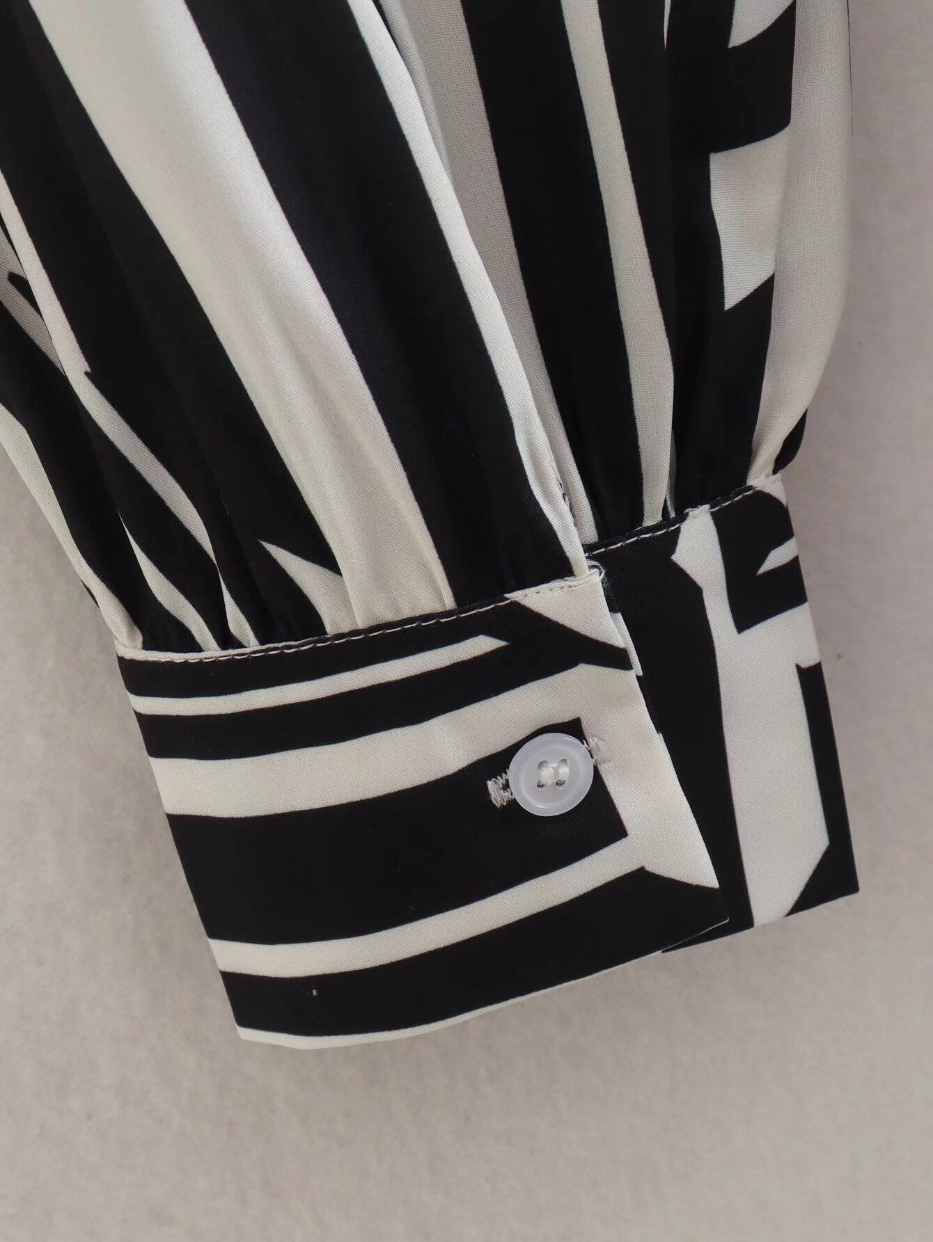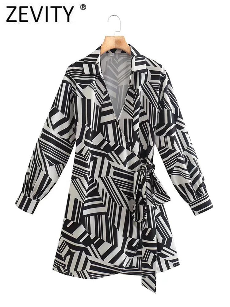 女性クロスVネック幾何学模様ボウタイドレスシックな長袖スリムミニ ロング リボン