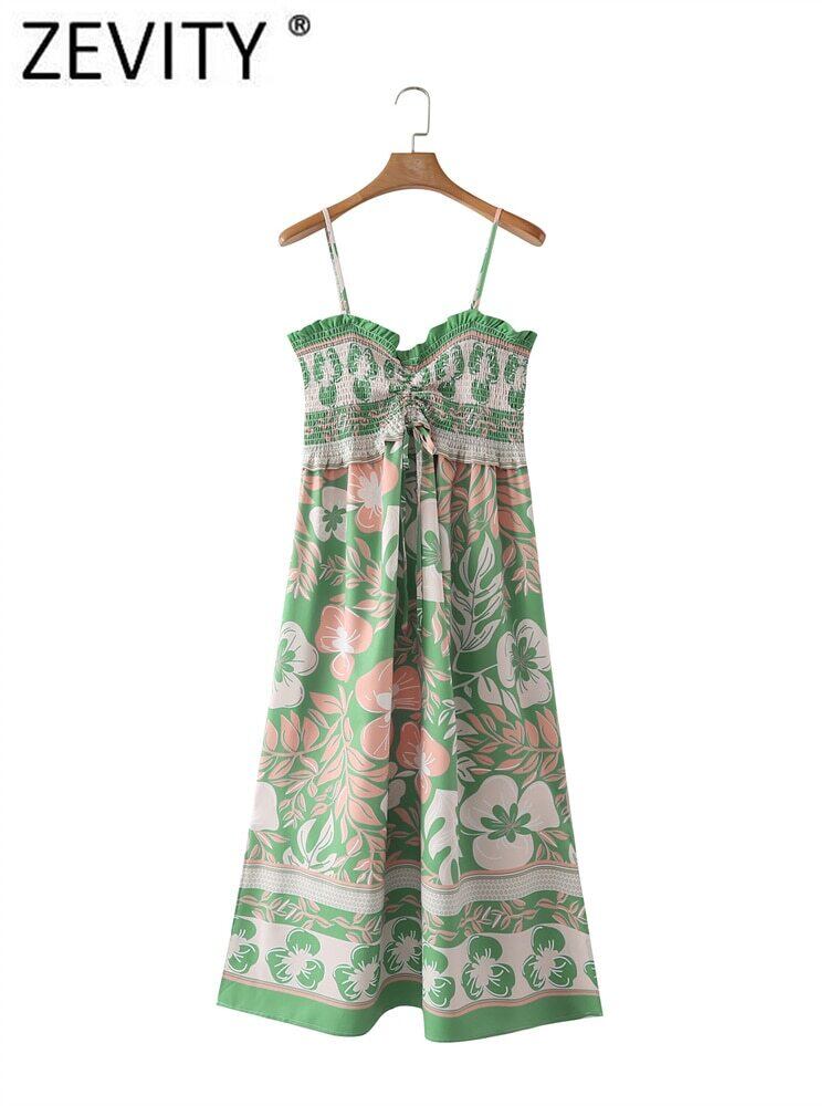 女性フローラルプリント弾性プリーツフリルスリングドレスシックなレースアップ夏ミディ ラッフル エラスティック 伸縮 サマー 夏物 花柄
