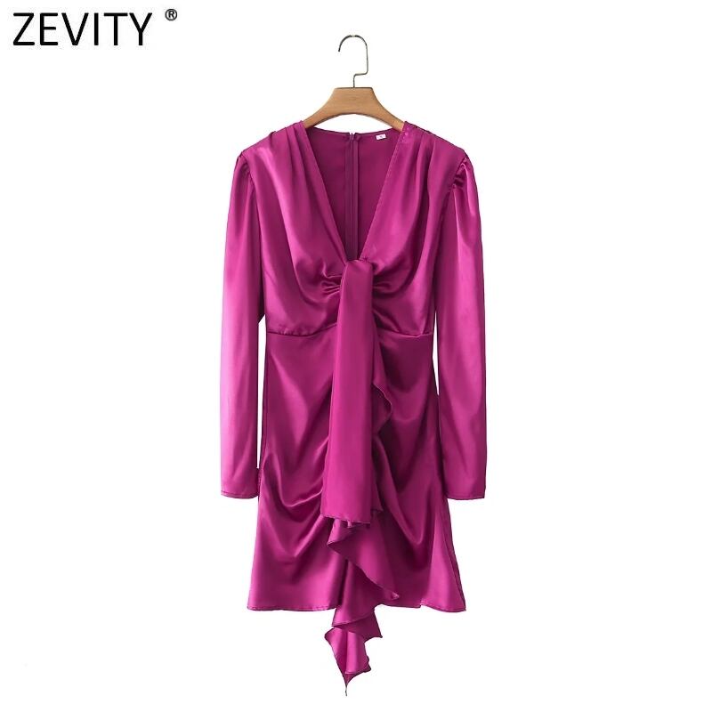 ZEVITYレディースフロントリボンデコレーションプリーツフリルソフトサテンミニドレスオフィスバックジッパー ラッフル 会社 学校 通勤や通学にも