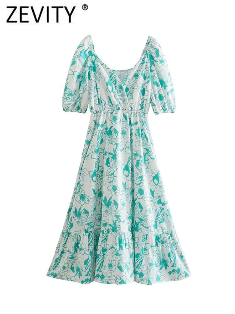 女性プリーツパフスリーブ抽象的な花柄ミディドレスシックなクロスVネックフリル ラッフル