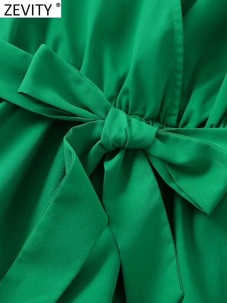 女性クロスVネックポジションフラワー刺繡ボウサッシュグリーンミニドレスシックスリムベスティドスDS1644 リボン 刺繍 フラワーデザイン