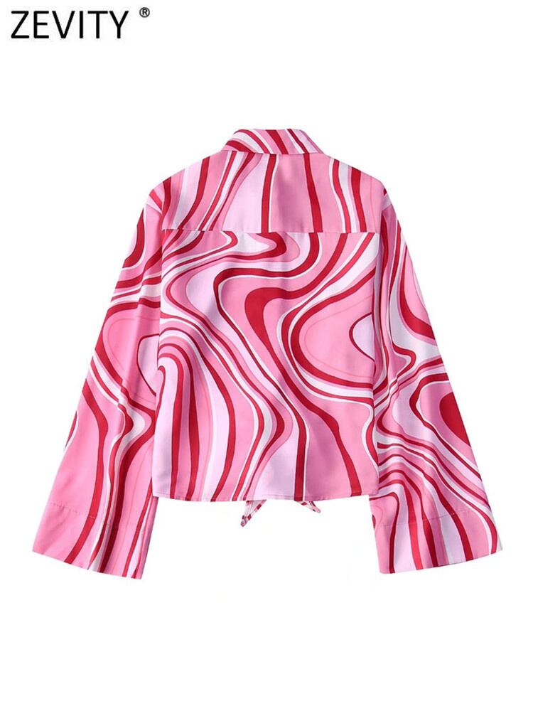 女性ウェーブデジタルプリントブラウスレディ裾結びボタンシャツシックなフレアスリーブトップスLS1211