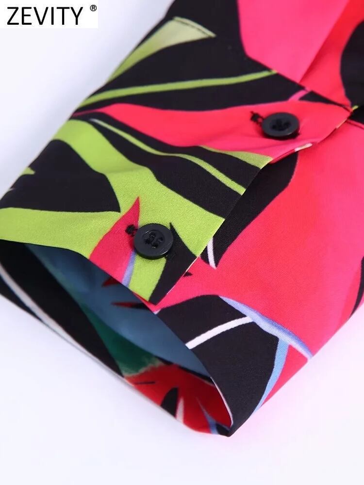 女性トロピカルリーフプリントサイドジッパースモックブラウスクロスヘムプリーツシャツシックビジネストップスLS982