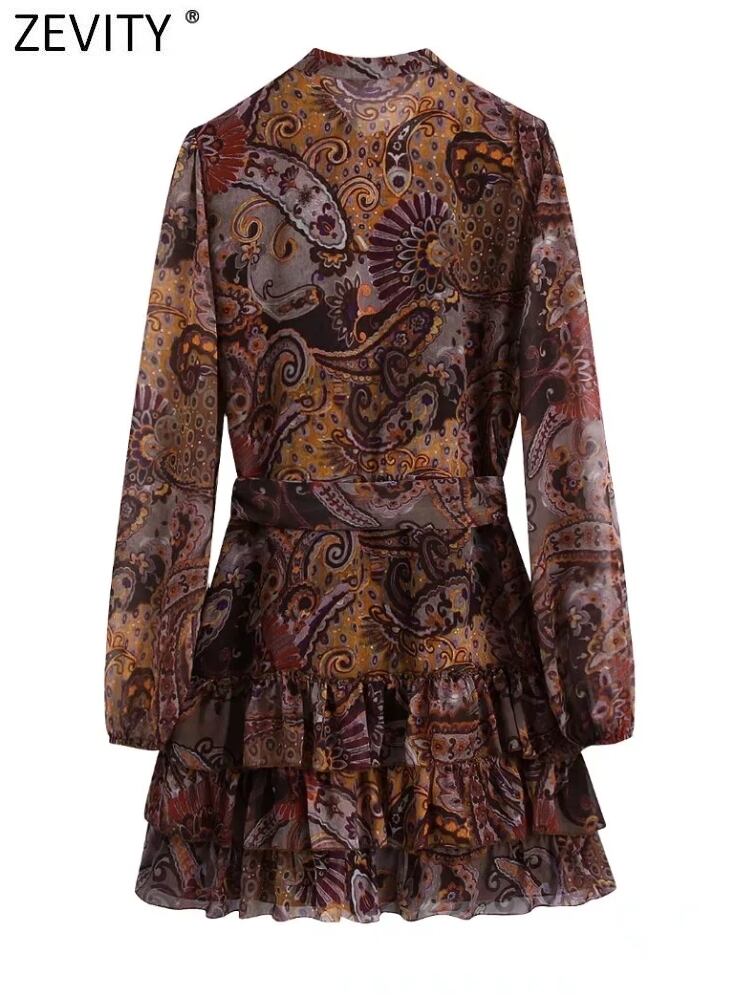 ZEVITY Women Totem Paisley Print Bow Sashes Mini Shirt Dress Chic Pleats Cascading Ruffle Slim Vestidos DS9342 ミニ リボン トートバッグ スリム