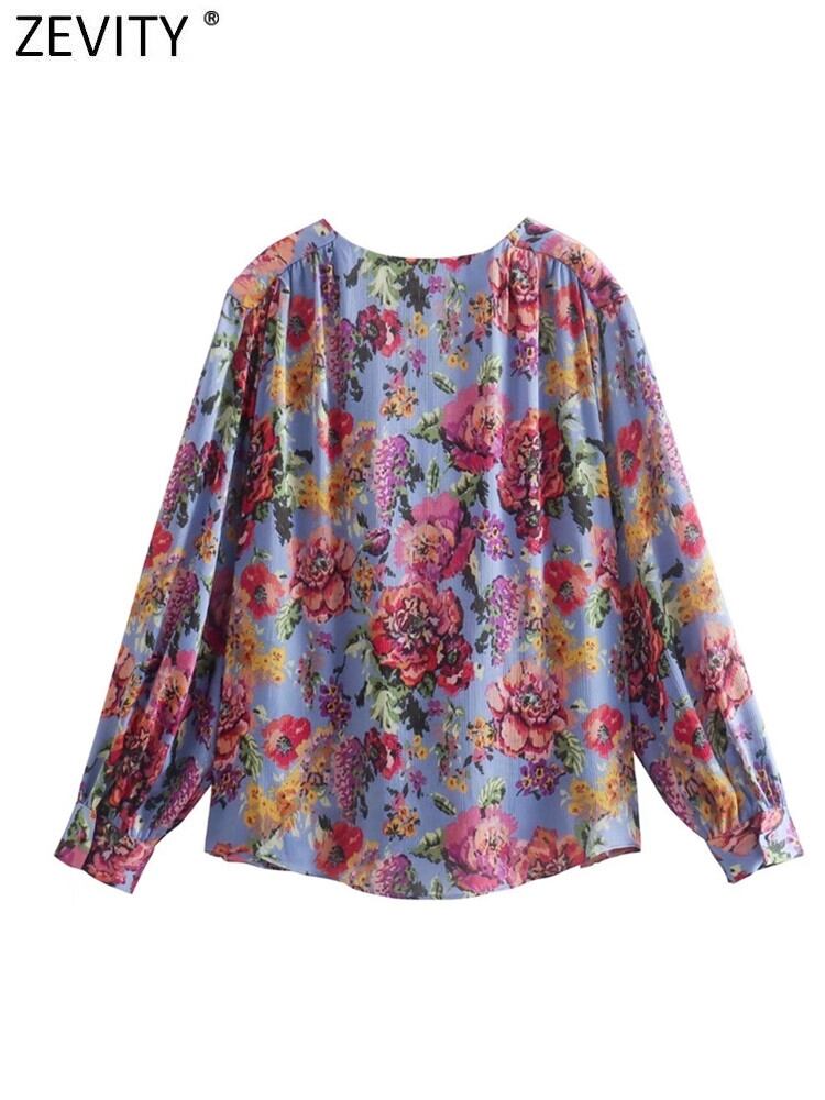 女性プリーツフリルフローラルプリントルーズスモックブラウスレディシックロングスリーブVネックシャツトップスLS10063 長袖 ラッフル 花柄