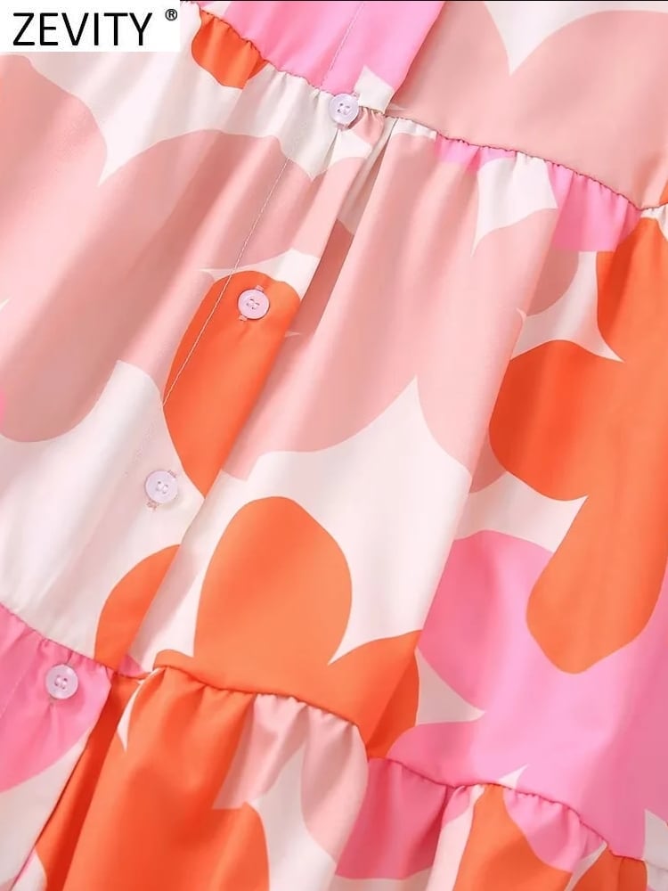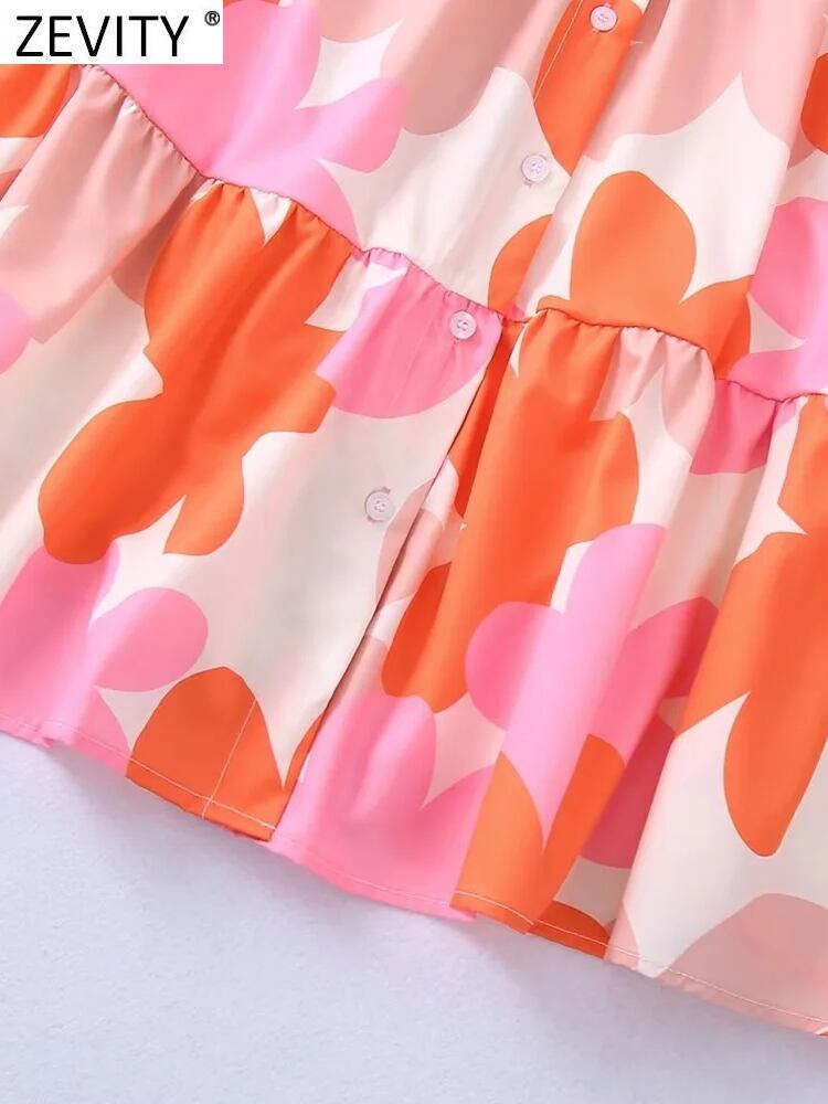 女性フローラルプリントパッチワークプリーツミニシャツドレスシックなパフスリーブビジネス 花柄