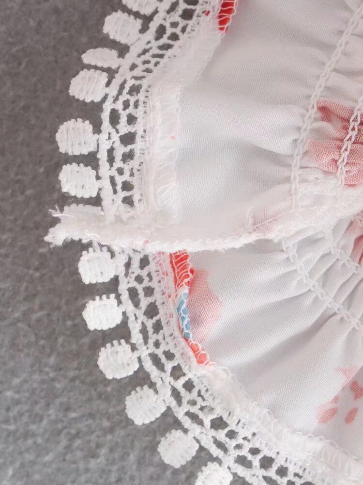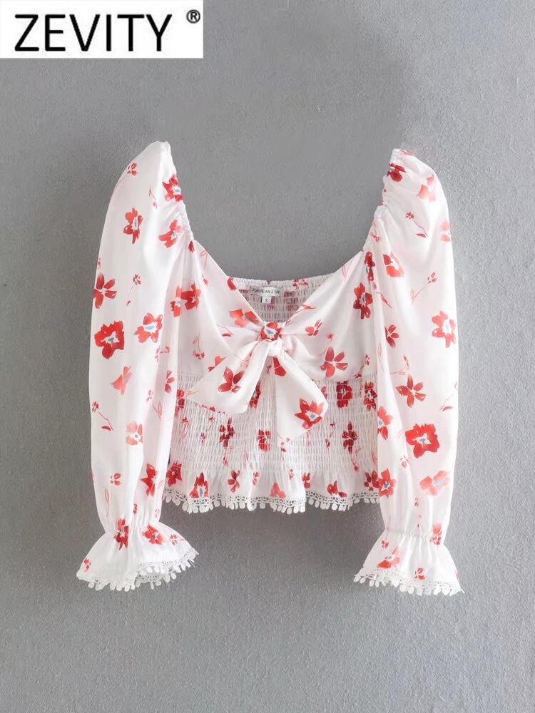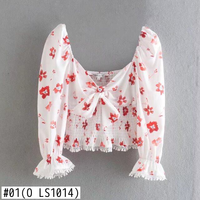 女性スウィートフローラルプリント裾ボールショートスモックブラウスボウパフスリーブ伸縮性シャツシックなクロップトップLS1014 リボン エラスティック 大人ガーリー キュート カジュアル 花柄