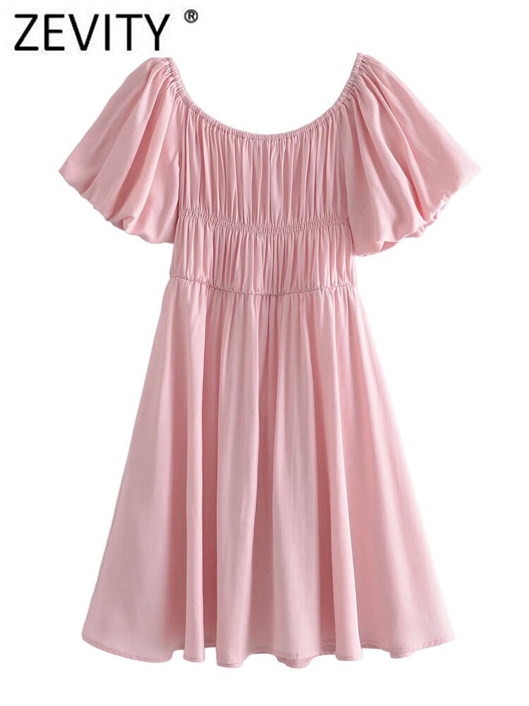 女性プリーツパフスリーブピンクカラーミニドレスシックなフレンチスタイル弾性スリムパーティー エラスティック 伸縮