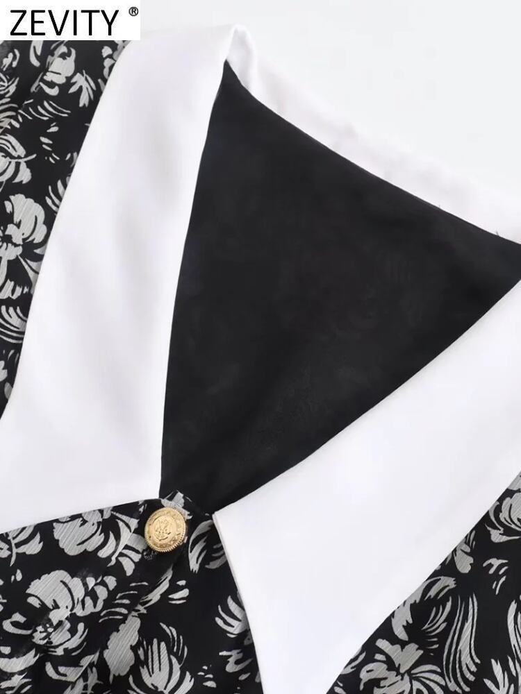 ZEVITYレディースホワイトカラーパッチワークフローラルプリント裾プリーツミニドレス長袖 ロング 花柄