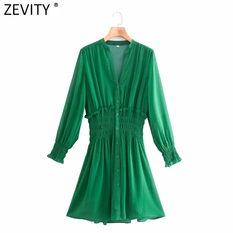 ZEVITY 女性 V ネックソリッド弾性プリーツシフォングリーンミニドレスシックな長袖フリルスリム Vestido DS8899 ロング ラッフル エラスティック 伸縮 Vネック ソリッドカラー