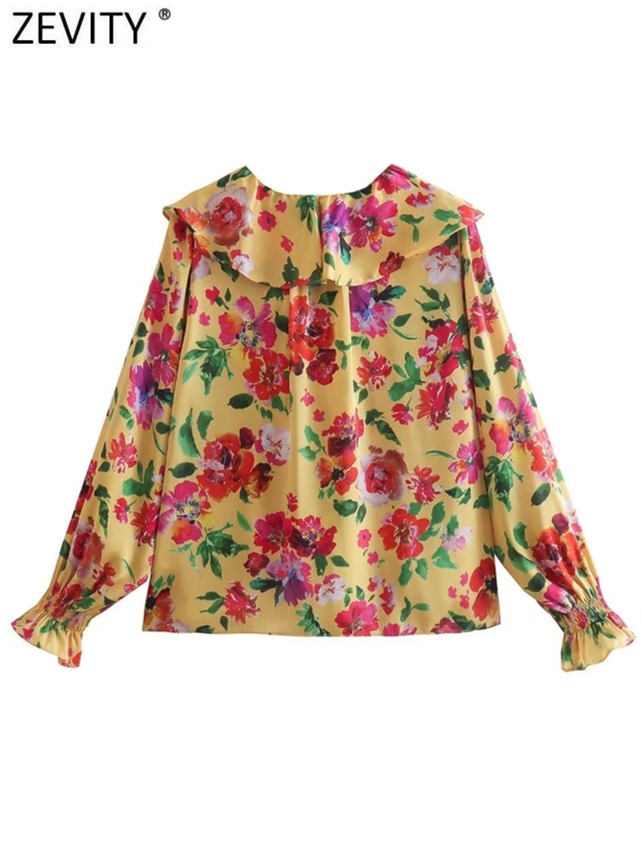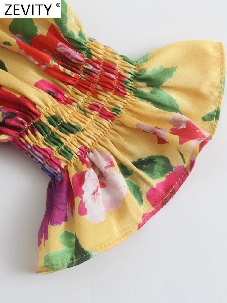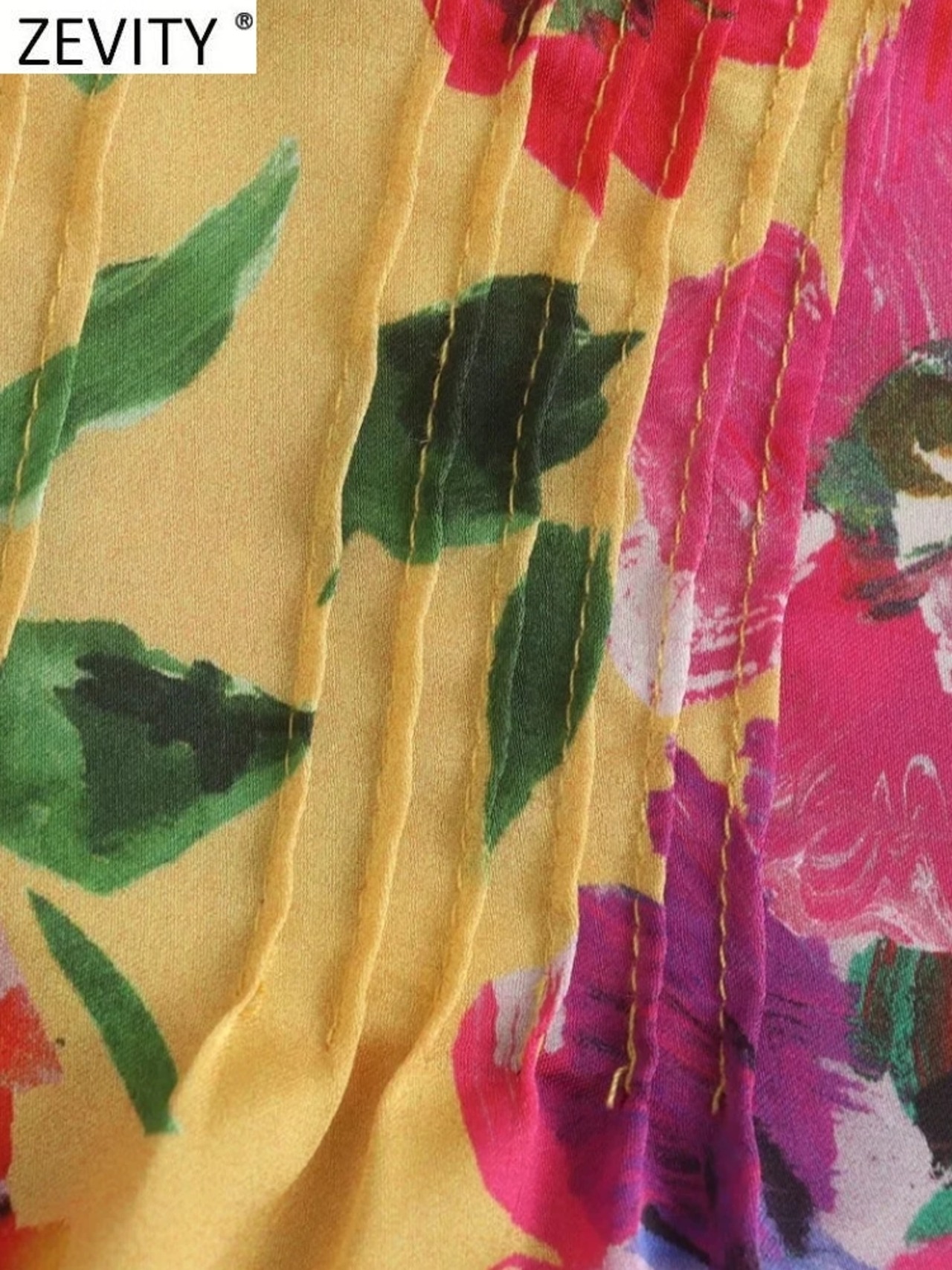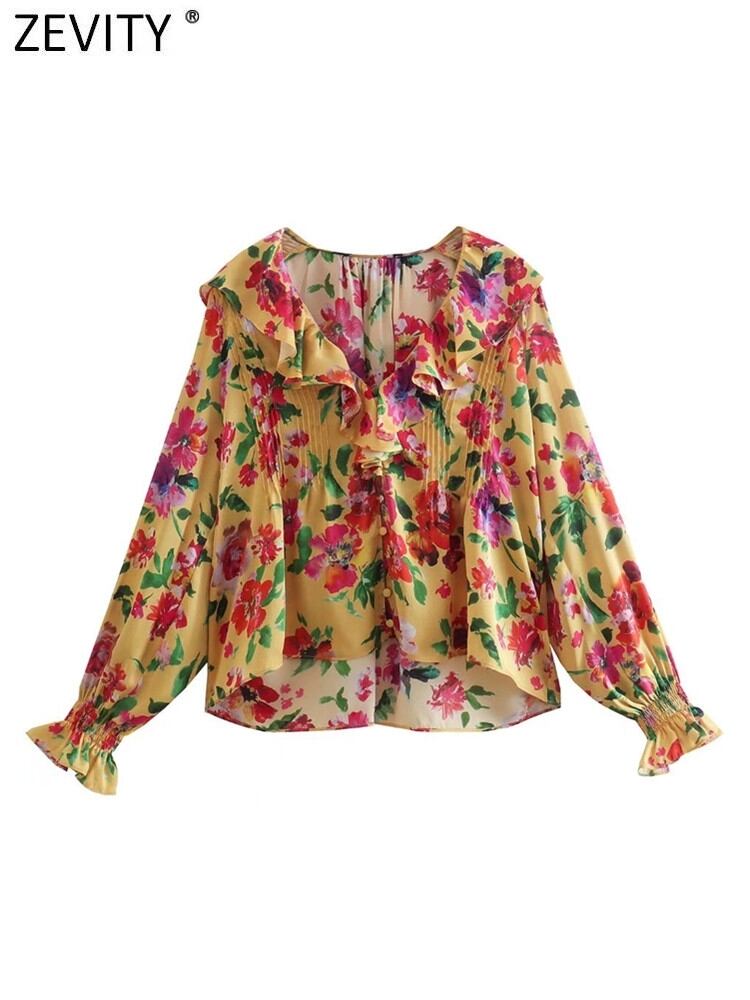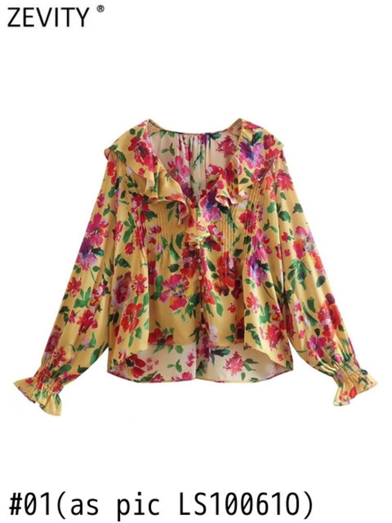 女性カスケード フリル V ネック花柄ブラウス プレス プリーツ シャツ シックなトップス LS10061 ラッフル Vネック