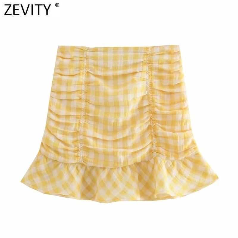 女性イエローチェック柄プリント裾フリルスリムプリーツスカート段 Faldas サイドジッパーシックな Vestido QUN846 ラッフル