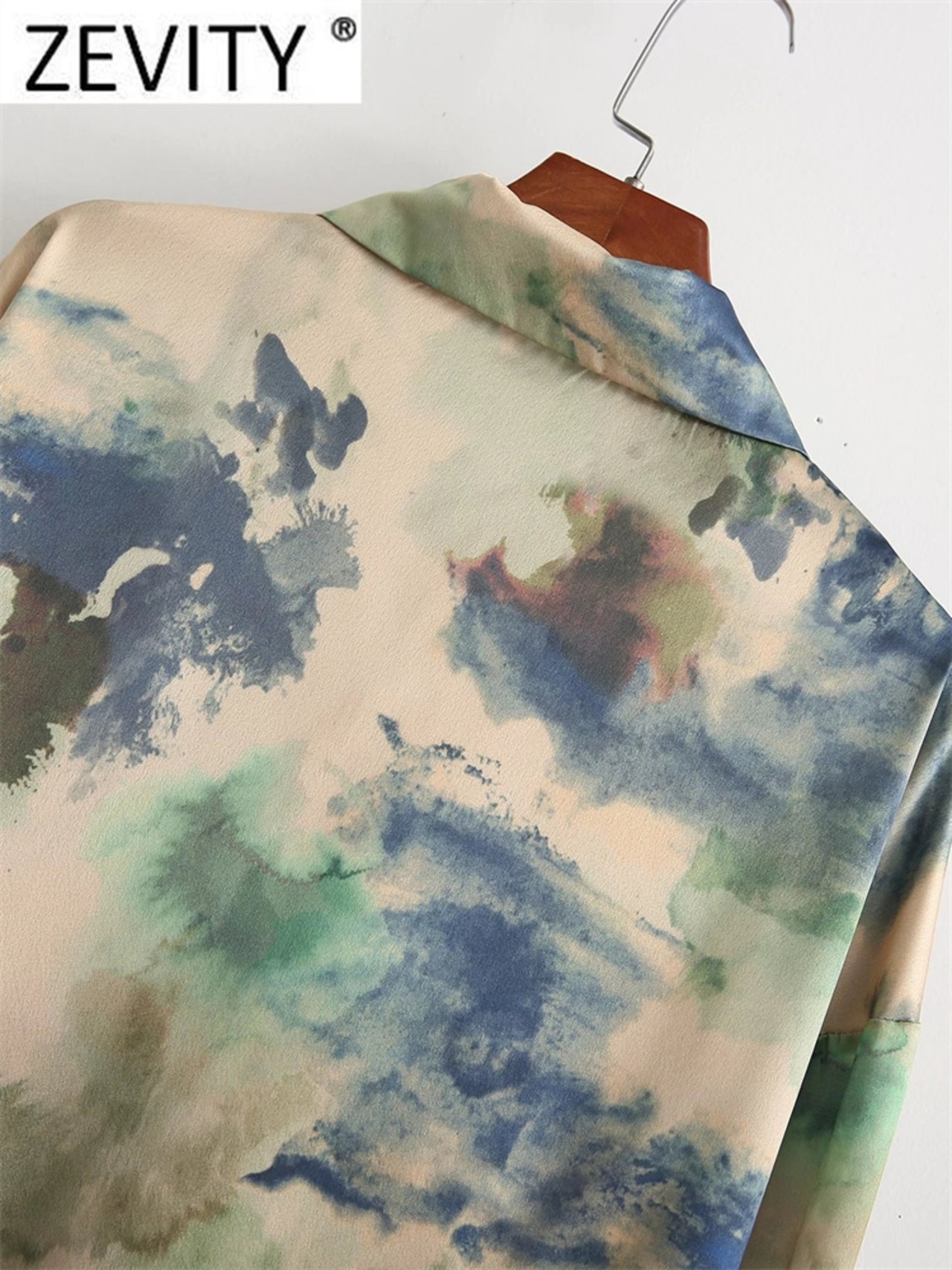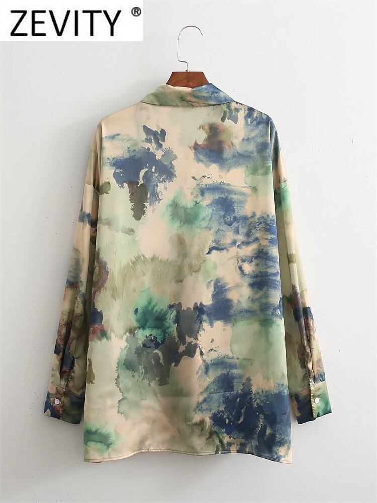 女性の水墨画プリントルーススモックブラウスレトロ絞り染めソフトタッチシャツビジネストップスLS1695
