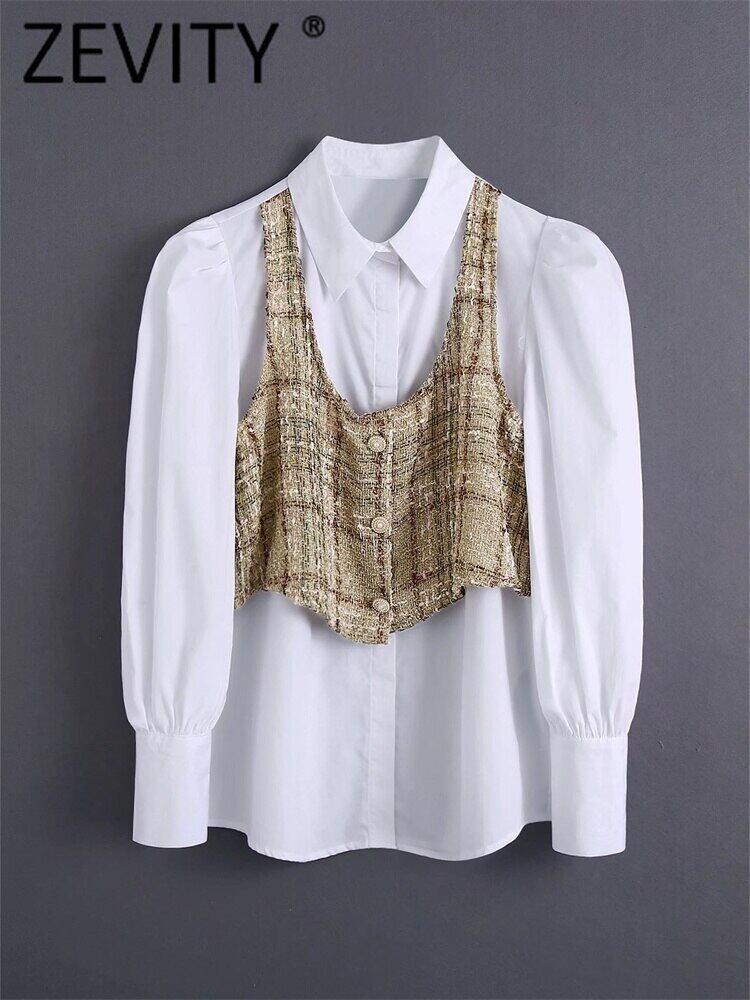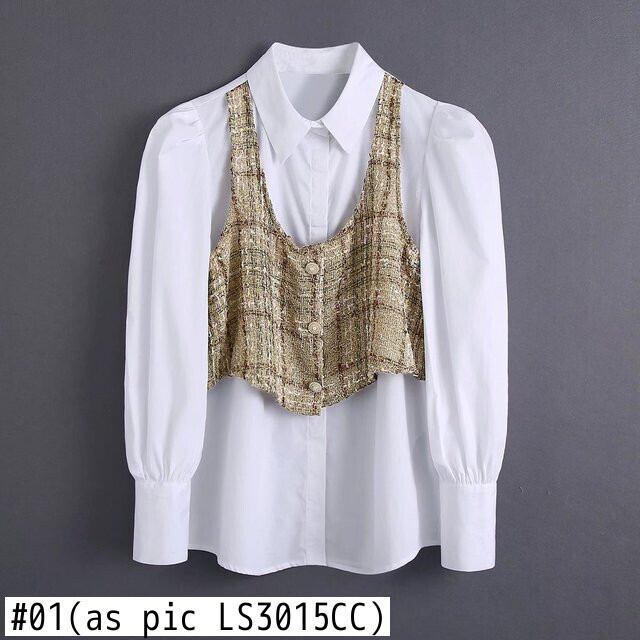 2022年女性チェック柄ツイードベストパッチワークホワイトポプリンブラウスオフィスレディビジネスシャツシックトップスLS3015 会社 学校 通勤や通学にも