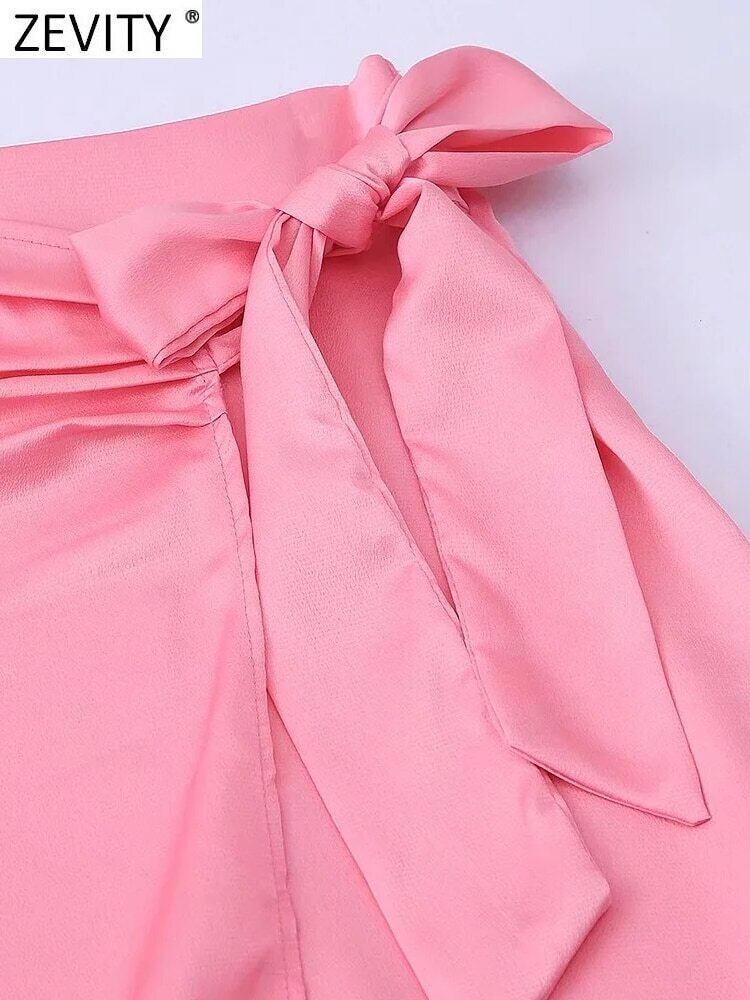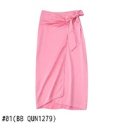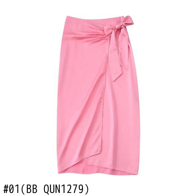 女性ピンクカラーボウタイドスリムサロンミドルスカートファルダスサイドジッパーソフトサテンベスティドスQUN1279 リボン