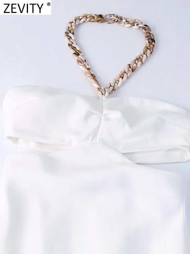 女性のセクシーなスプリット中空アウトチェーンストラップホワイトホルターミディドレスシックなバックレスジッパーフライ Vestidos DS1263