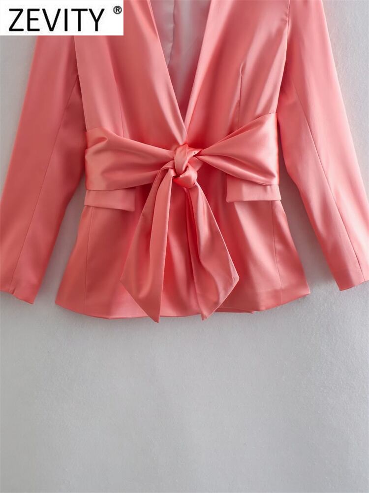 女性 V ネック無地ソフトタッチ弓縛らベルトブレザーコートシックなポケットビジネススリムスーツトップス CT2007 リボン ハーネス Vネック ソリッドカラー