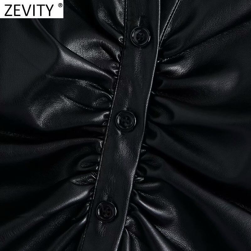 2021 女性シングルブレストプリーツスリムブラウスオフィスレディブラック PU レザーシャツシックなトップス LS9743 会社 学校 通勤や通学にも