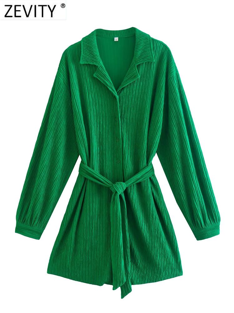女性ターンダウン襟シングルブレストルーズグリーンミニショートドレスシックな弓サッシ Vestidos DS2183 リボン