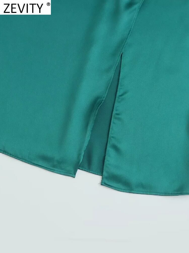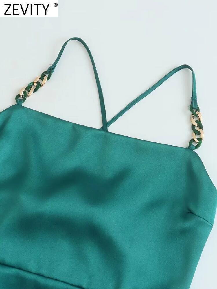 女性のセクシーなチェーンスパゲッティストラッププリーツソフトサテンスプリットミディドレスシックな背中の開いたジッパー Vestidos DS2180