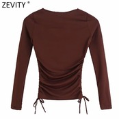 2021 女性単にスクエアカラーソリッド弾性プリーツショートシックな Tシャツ長袖スリムクロップトップス LS7650 ロング エラスティック 伸縮 ソリッドカラー スクウェア シンプル