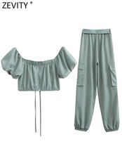 女性オフショルダープリーツレースアップショートクロップシャツサファリスタイルポケットパッチパンツ 2 枚セット SU102