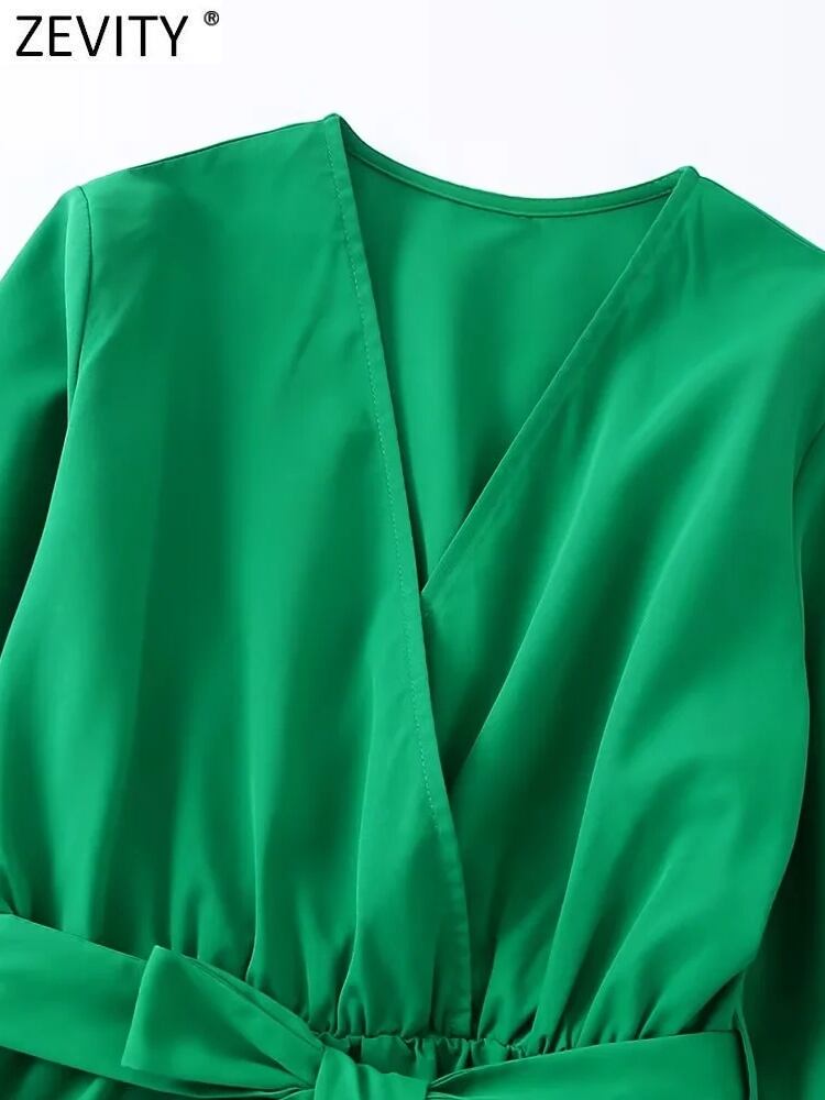 女性クロス V ネック位置花刺繍弓サッシグリーンミニドレスシックなスリム Vestidos DS1644 リボン Vネック フラワーデザイン