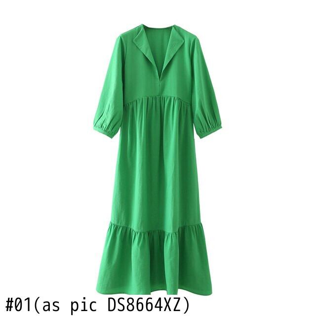女性 V ネック裾プリーツ フリル グリーン ミディ ドレス シックなオフィス七分袖 Vestido DS8664 ラッフル Vネック 会社 学校 通勤や通学にも