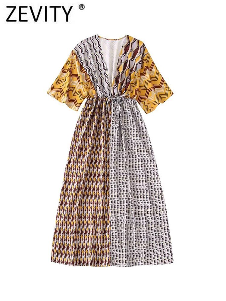 女性幾何パッチワークプリント弾性ウエストスリムミディドレス V ネック Vestidos シックなドレス DS1718 エラスティック 伸縮 Vネック