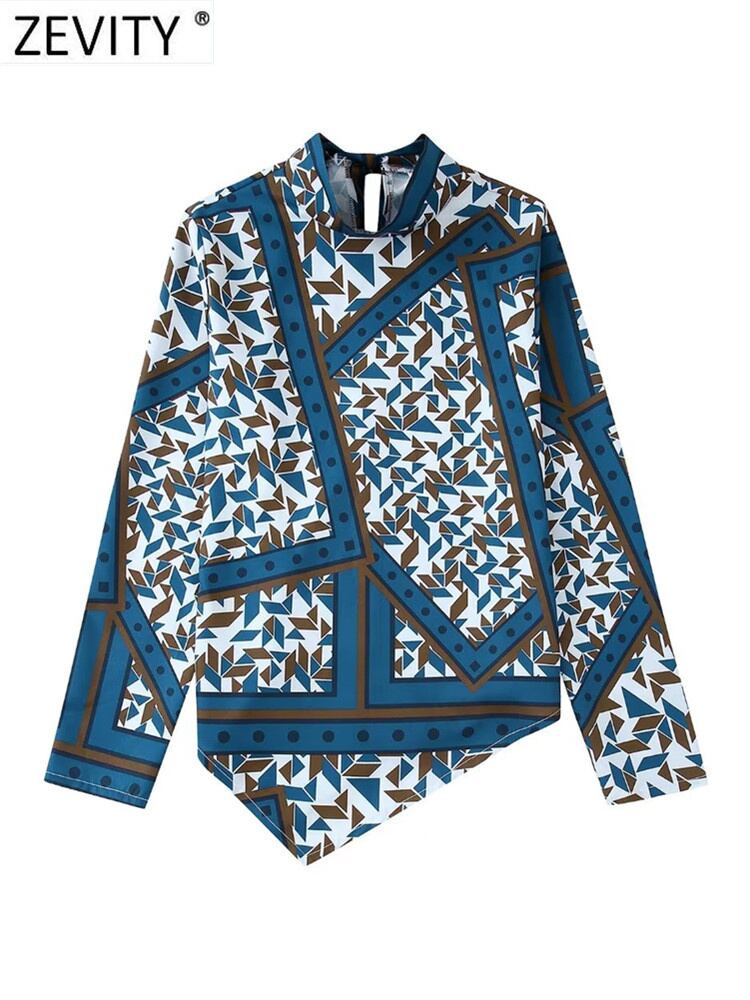 女性スタンドカラー幾何学パッチワークプリントスモックブラウス裾不規則なシックなトップス LS2108