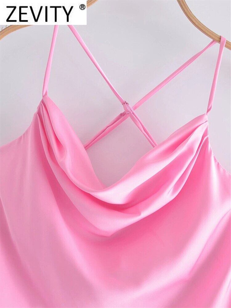 女性シックなスパゲッティストラップ無地ソフトサテンスリングキャミソールタンク夏背中の開いたクロスクロップトップス LS327 サマー 夏物 ソリッドカラー