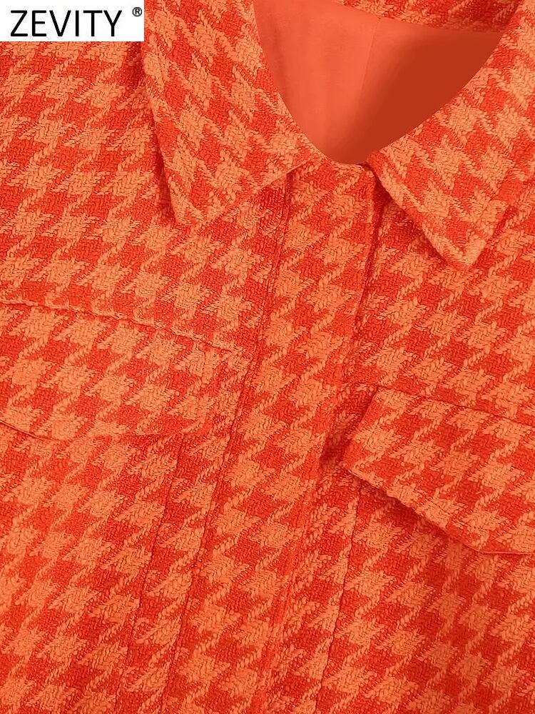女性千鳥格子プリント レジャー ショート オレンジ コート ダブル ポケット パッチ ツイード ウール ジャケット トップス CT403