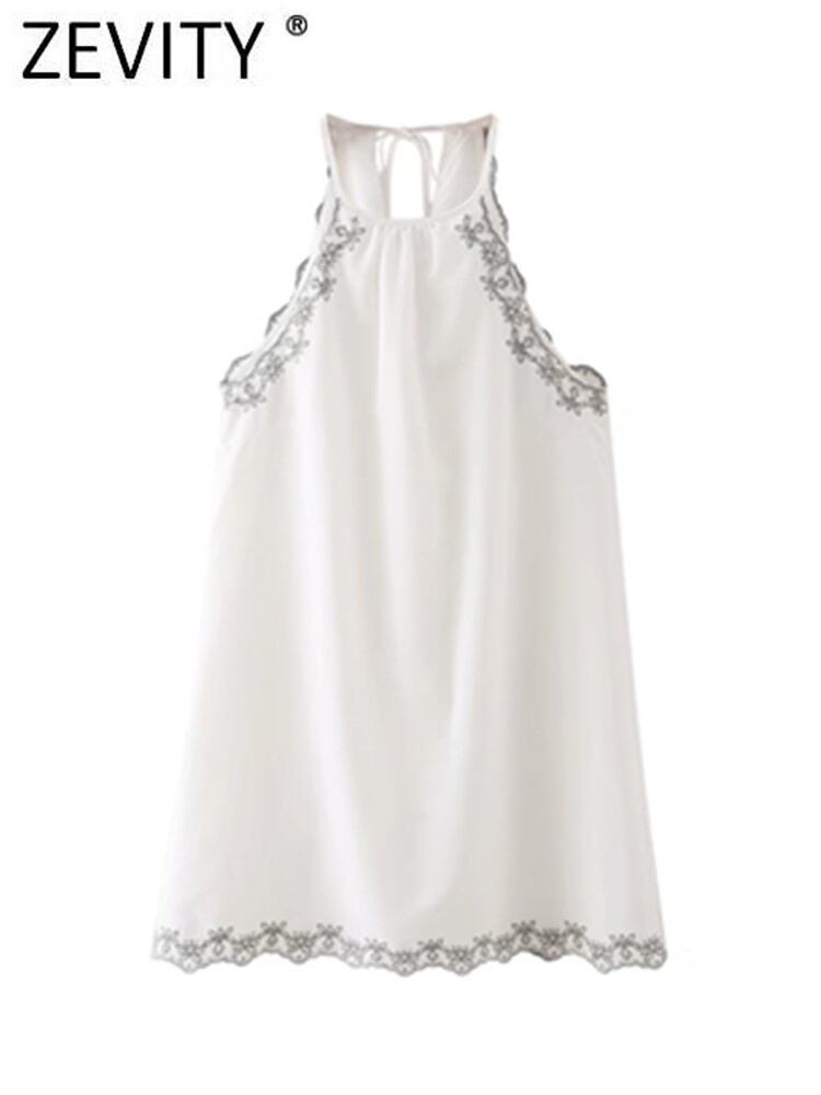 女性中空アウト刺繍ホワイトシフォンミニドレスシックなノースリーブレースアップホルター Vestidos DS1592