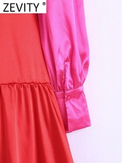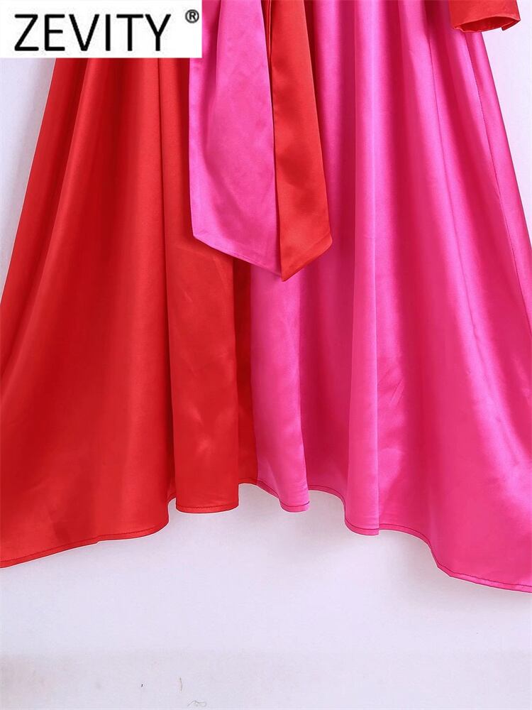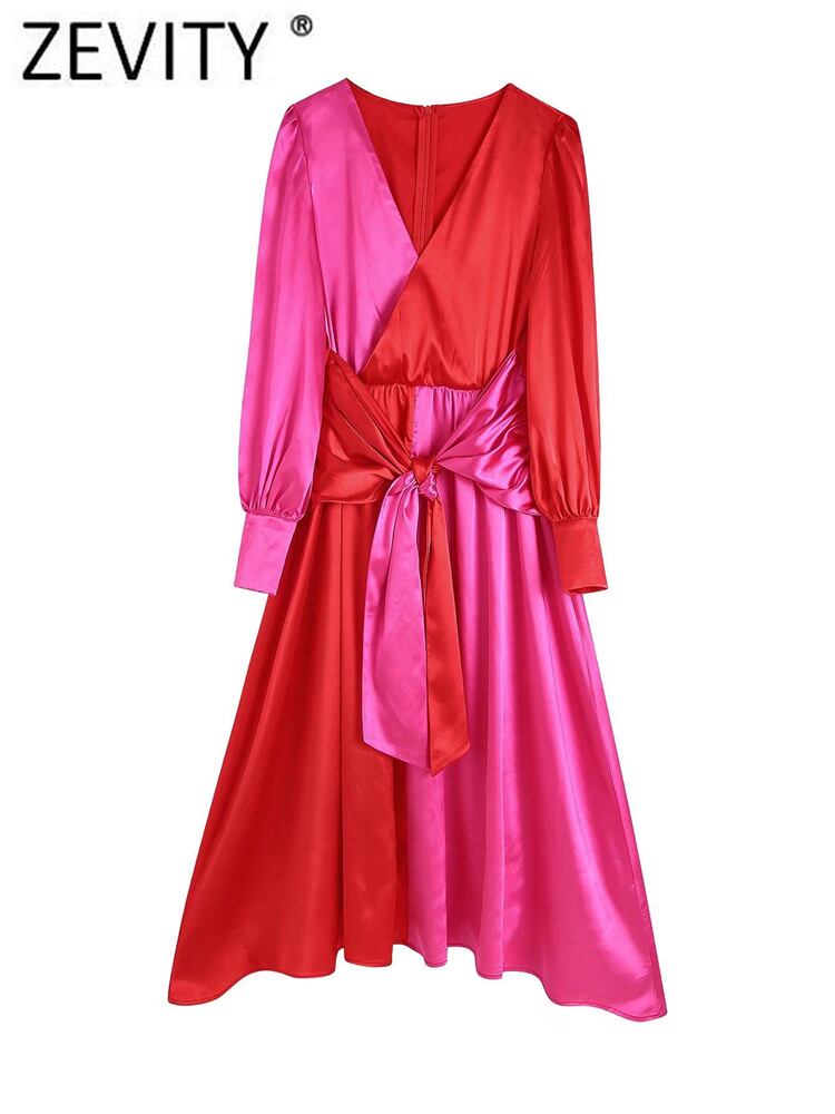 女性 V ネックカラーマッチングパッチワークサテンミディドレスシックな長袖蝶ネクタイサッシ Vestidos DS1622 ロング リボン Vネック