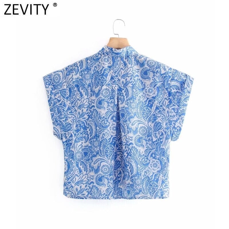 女性ターンダウン襟ブルー花柄シャツ半袖サイドスプリットブラウス Roupas シックなトップス LS9374 ショート ハーフスリーブ