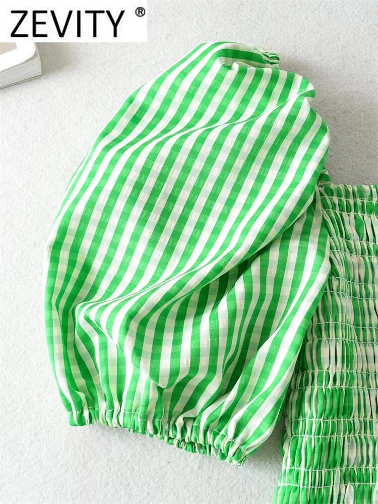 女性スウィートスクエアカラーグリーンチェック柄プリントスリムスモックブラウスパフスリーブ弾性フリルシャツシックなトップス LS1195 ラッフル エラスティック 伸縮 大人ガーリー キュート カジュアル スクウェア