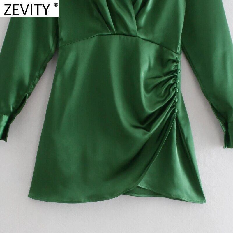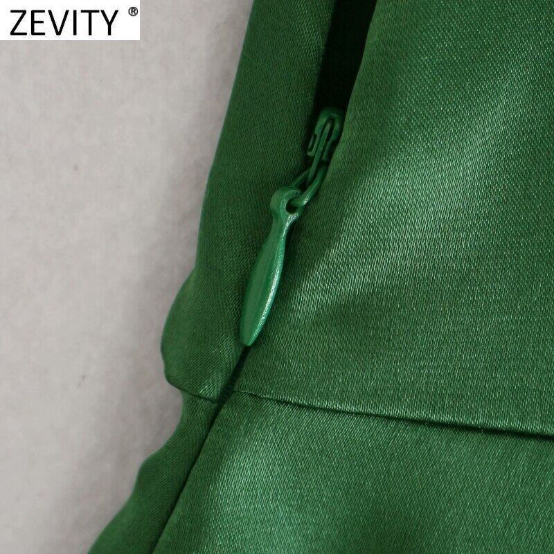 ZEVITY 女性ターンダウン襟ダブルブレストグリーンサテンドレスオフィスレディシックなプリーツバックル Vestido DS9208 会社 学校 通勤や通学にも