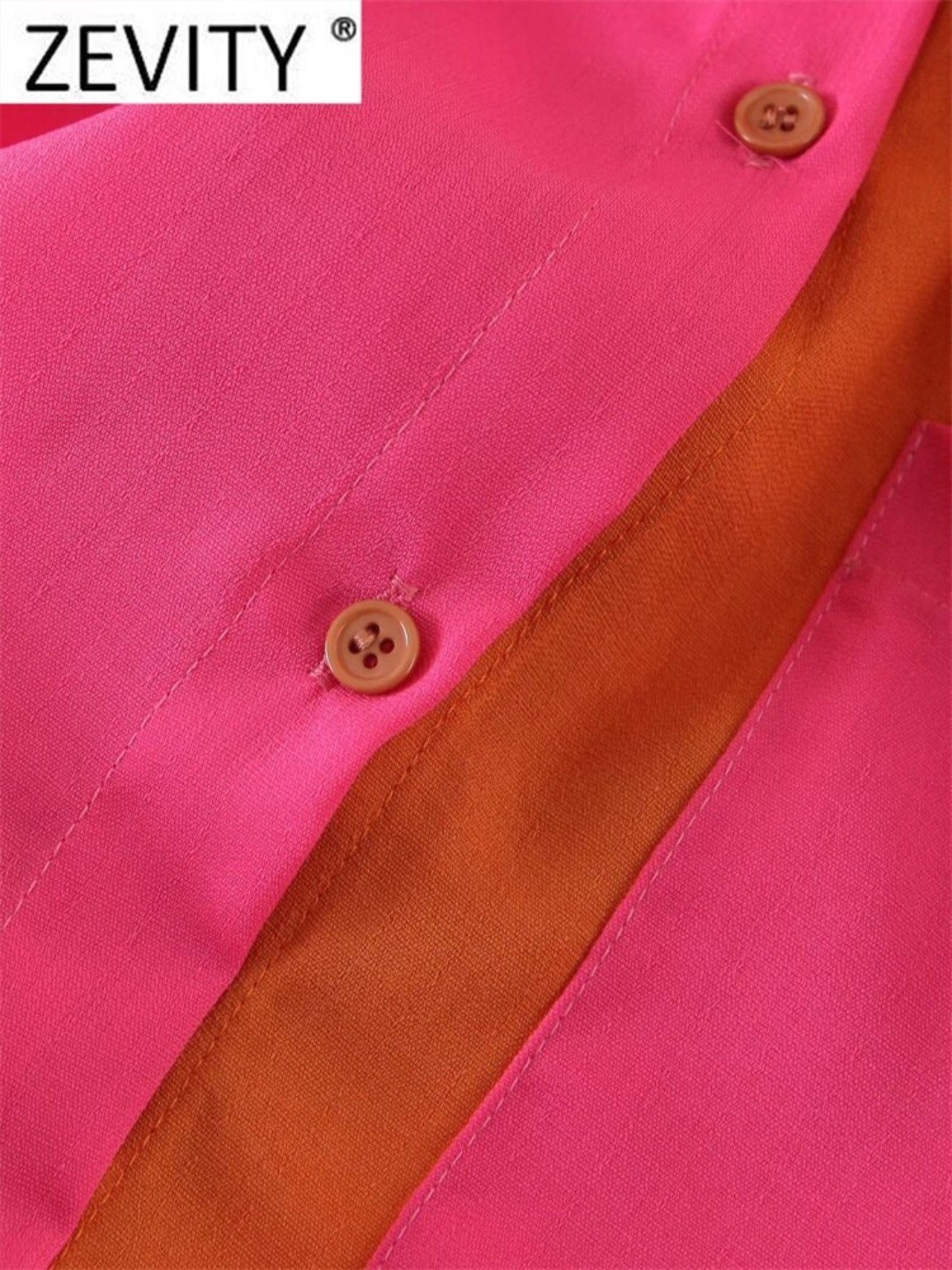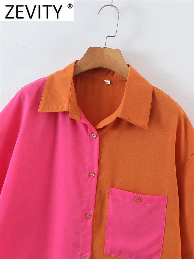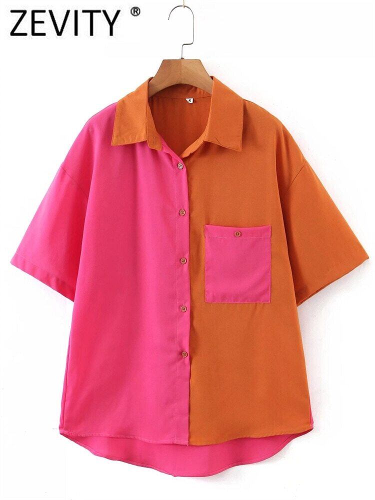 女性カラーマッチングシングルポケットパッチルーズブラウスレディー半袖シャツシックトップス LS1794 ショート ハーフスリーブ