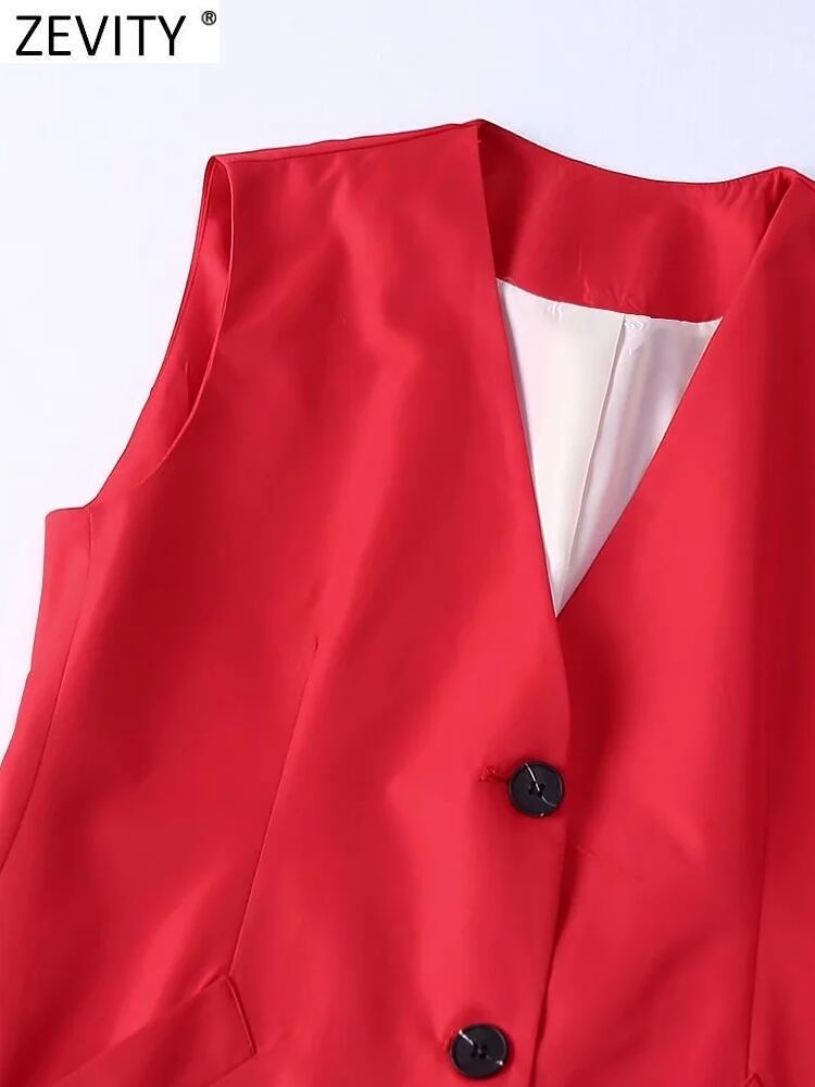 女性 V ネック黒ボタン赤ベスト ジャケット オフィス ノースリーブ ビジネス チョッキ シックなロング トップス CT1245 レッド ブラック Vネック 会社 学校 通勤や通学にも