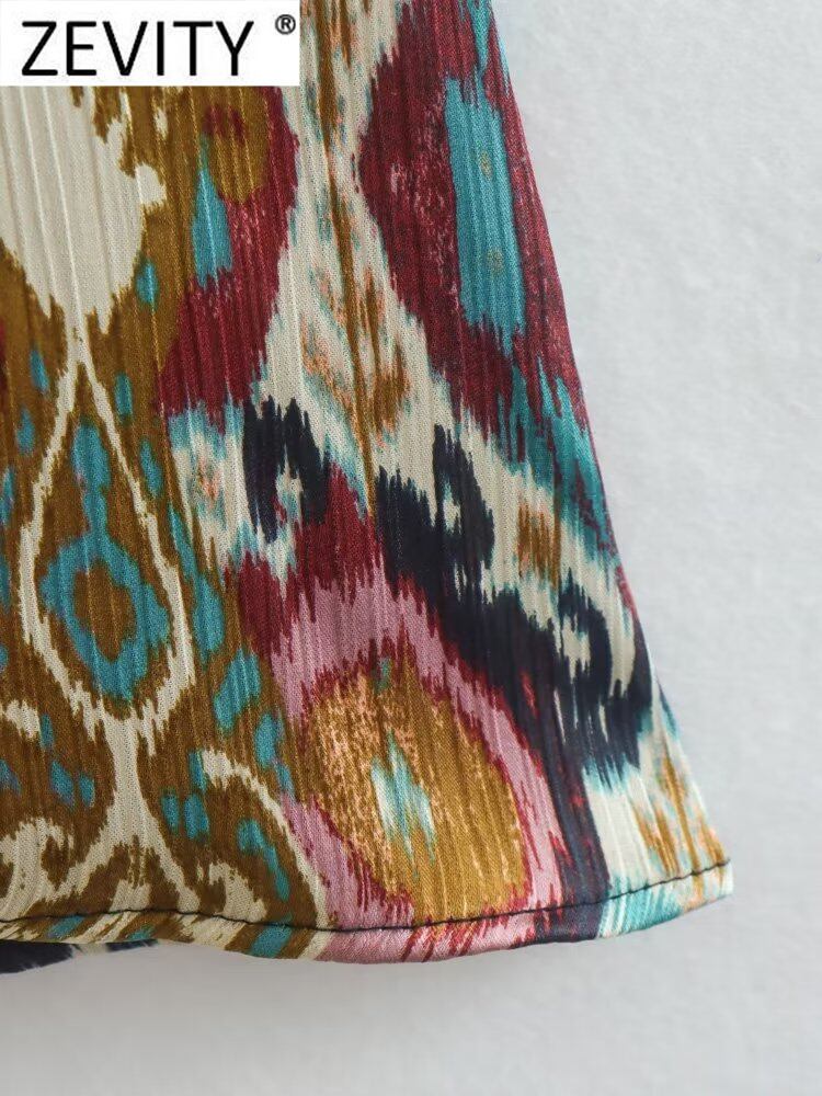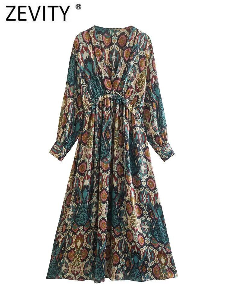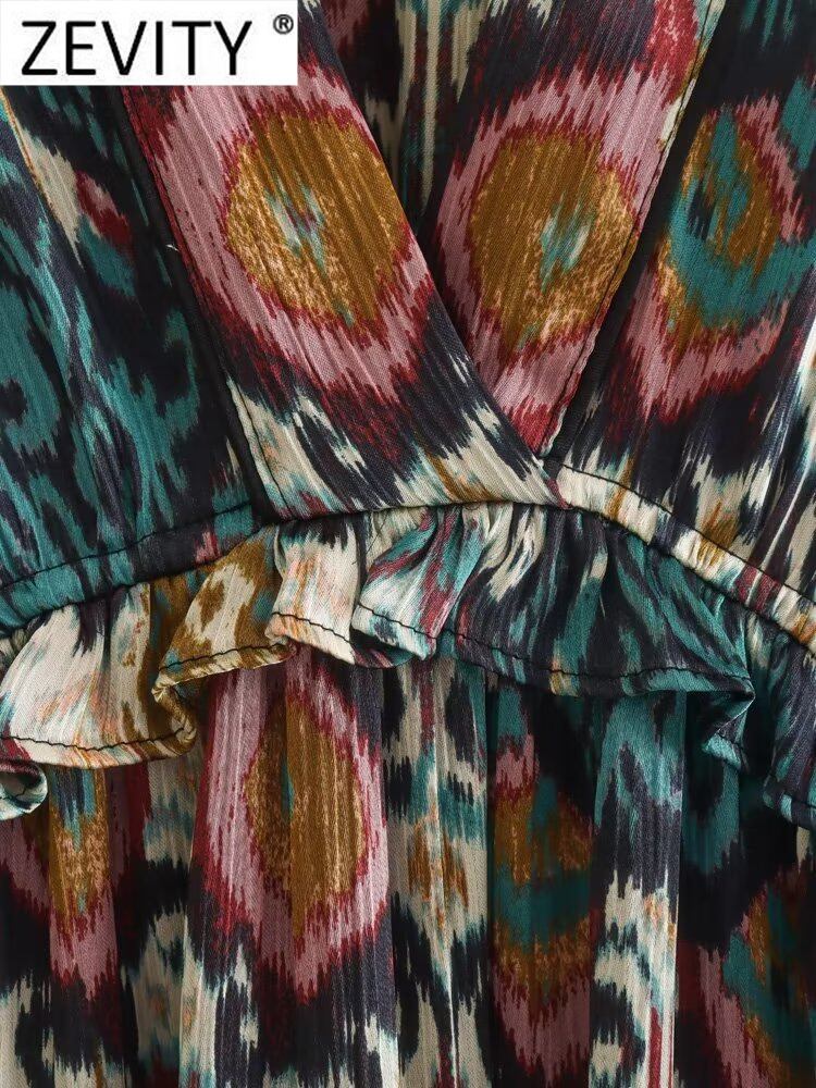 レディースVネックプリント柄ウェストフリルミディドレス スタンダード レトロ ラッフル Amy34206125603