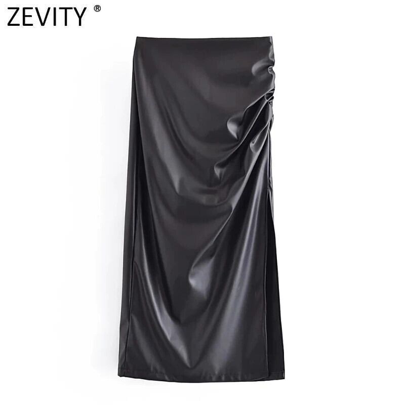 女性サイド プリーツ PU レザー スプリット ストレート ミディ スカート ファルダス バック ジッパー Vestido QUN883