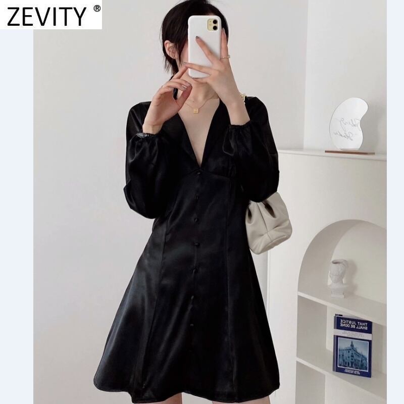 女性ターンダウン襟シングルブレスト黒シャツドレス長袖スリムシックなサテン Vestido DS8696 ロング ブラック