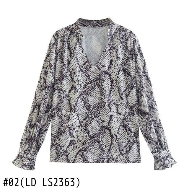 女性ヘビ皮プリント プリーツ スモック ブラウス フリル長袖プルオーバー シャツ シックなトップス LS2363 ロング