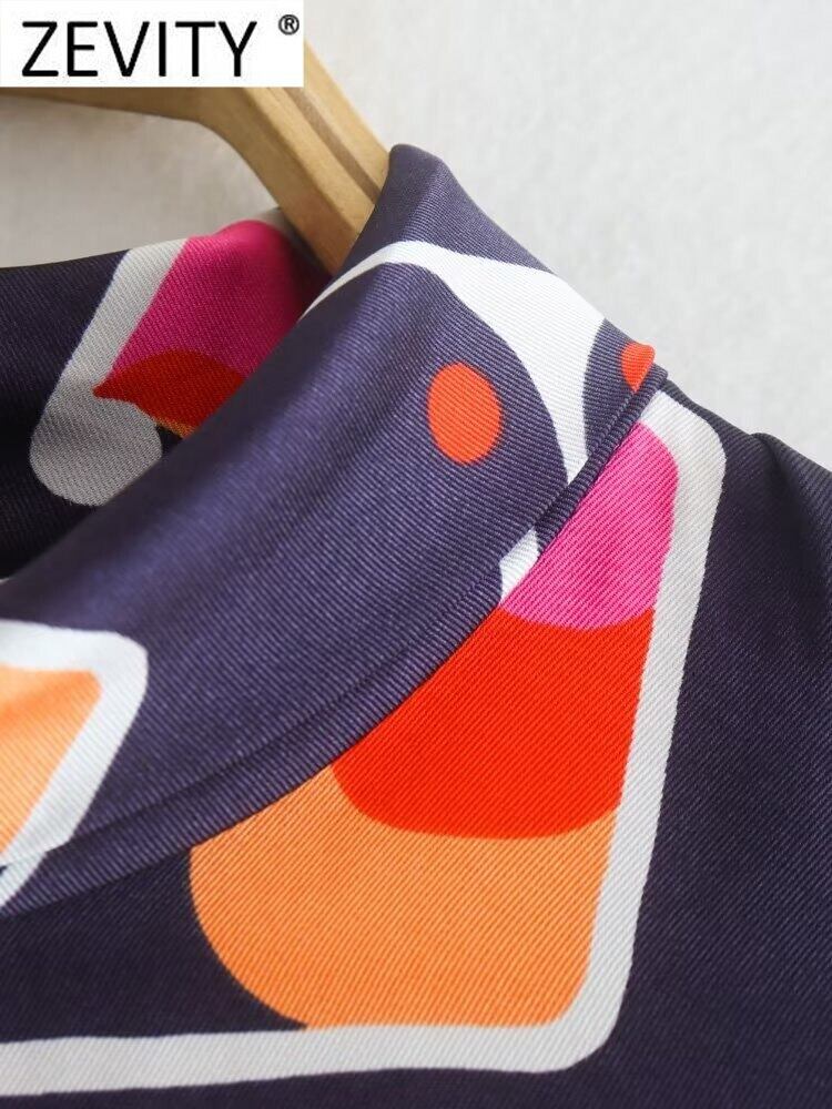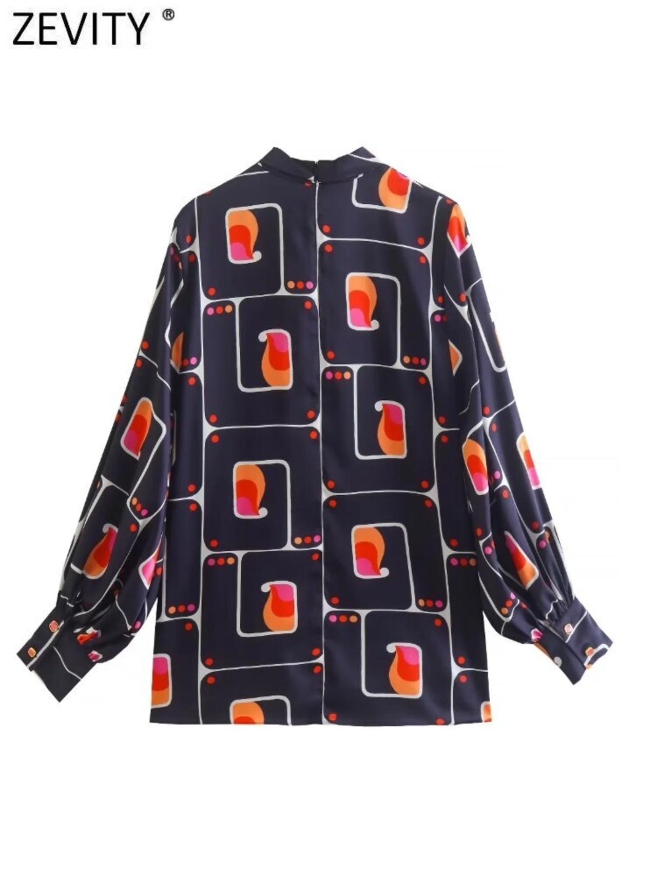 女性スタンドカラー幾何学プリントソフトスモックブラウスバックジッパープルオーバーシャツシックトップス LS2766